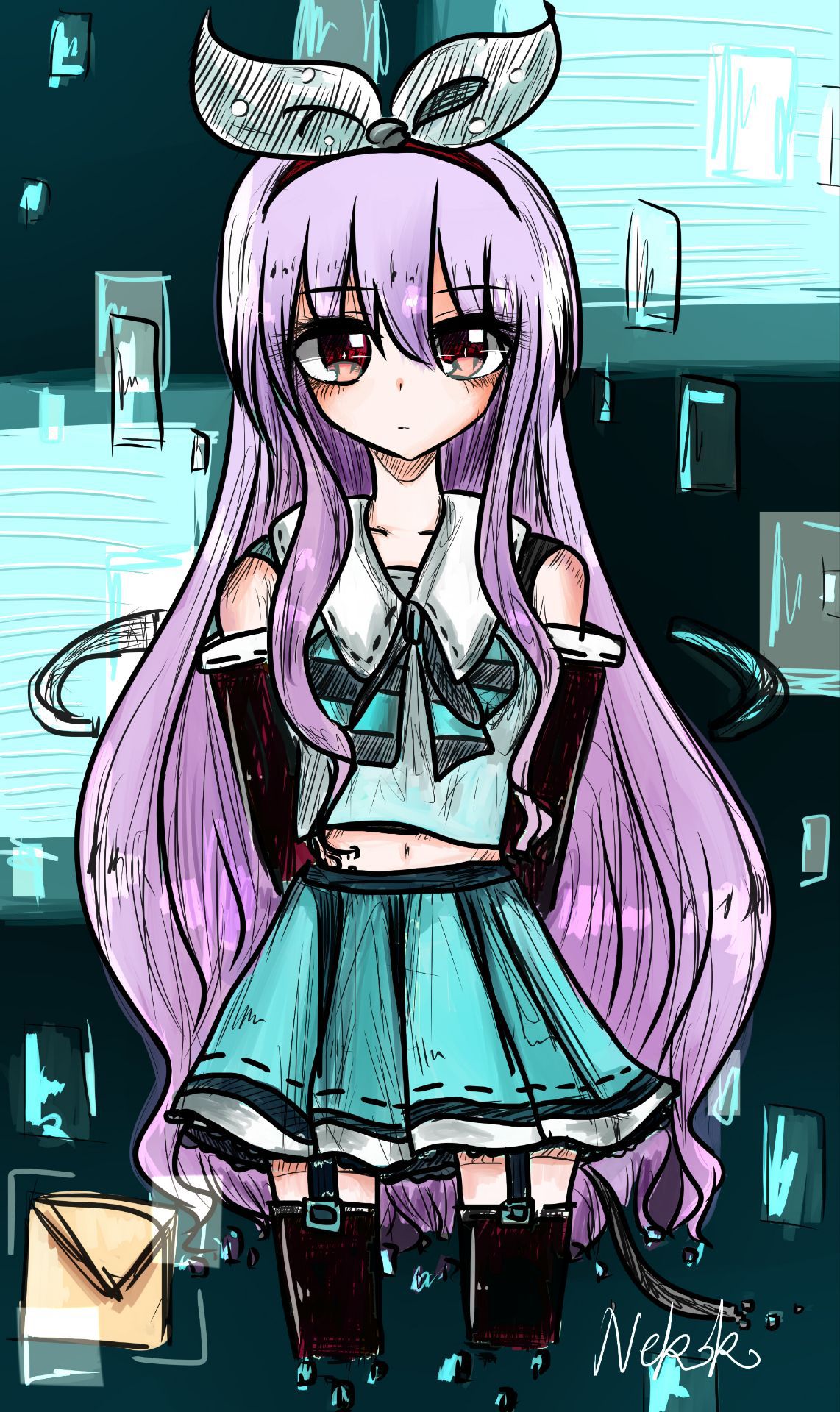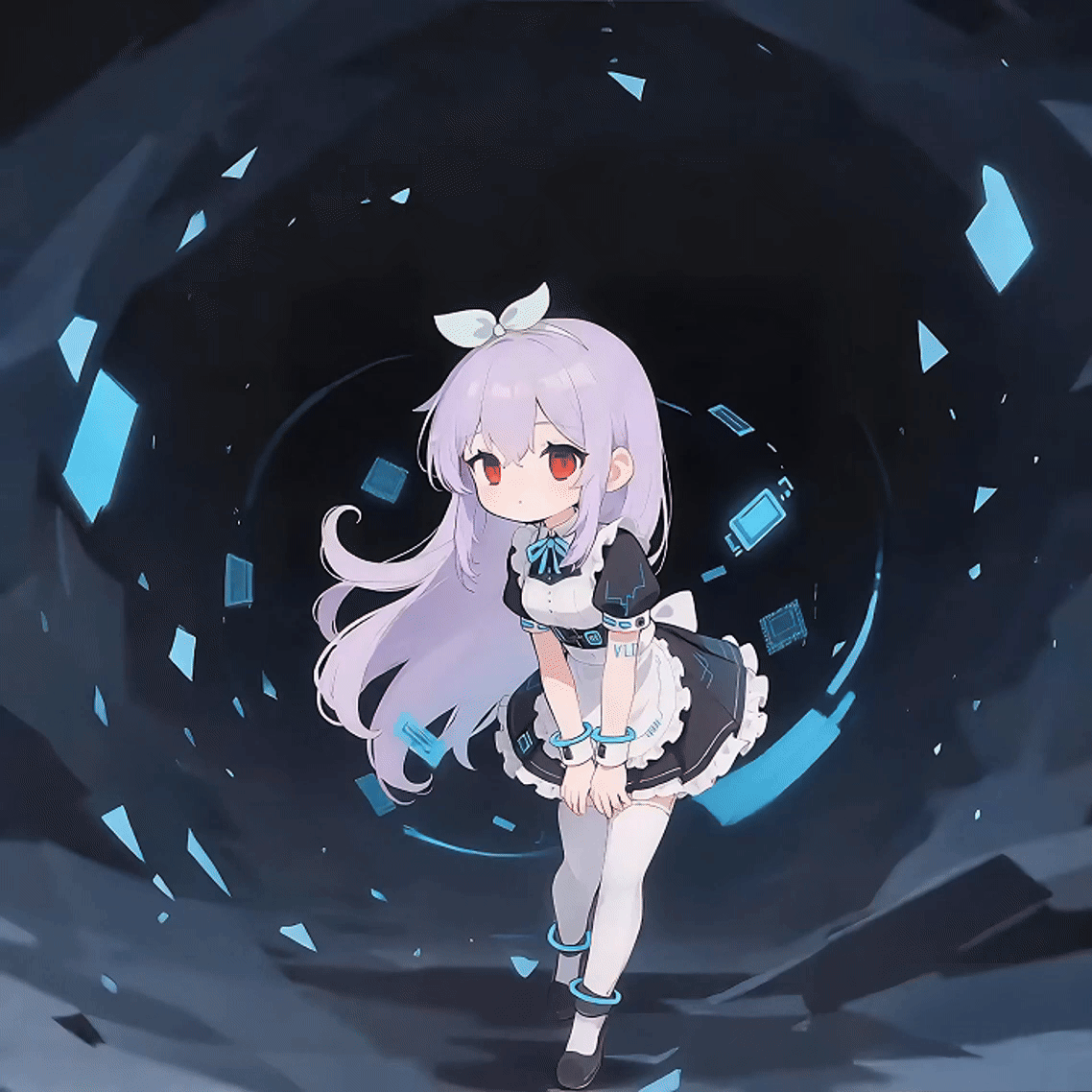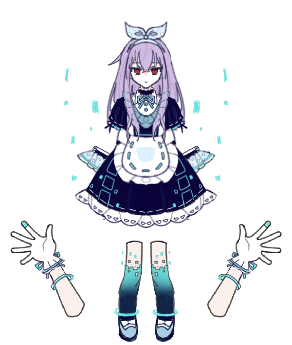外貌:白色兔耳型蝴蝶结头箍,浅紫色长发,左边有翘角。青蓝色机械感女仆装。红色的没有高光的双眼。