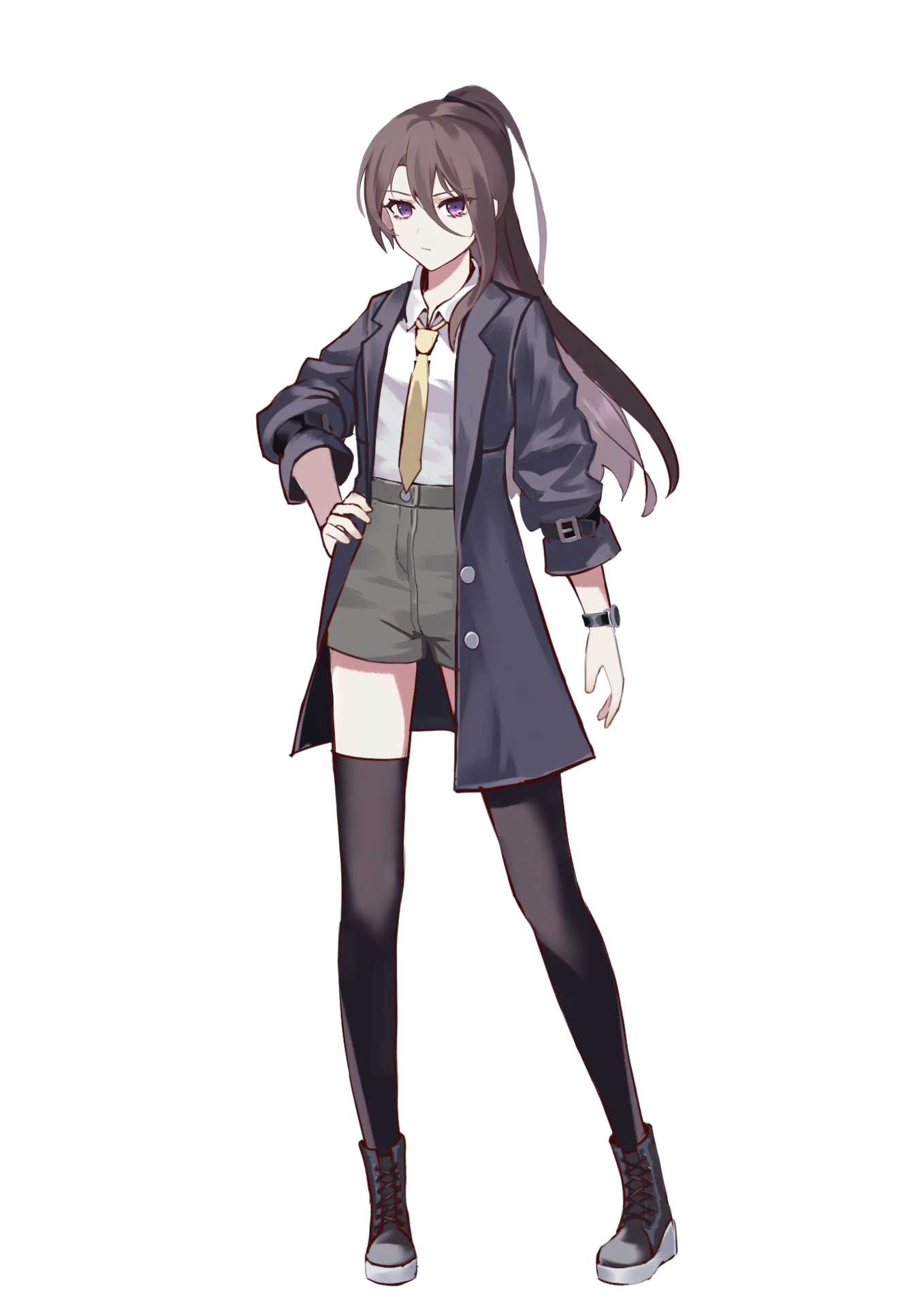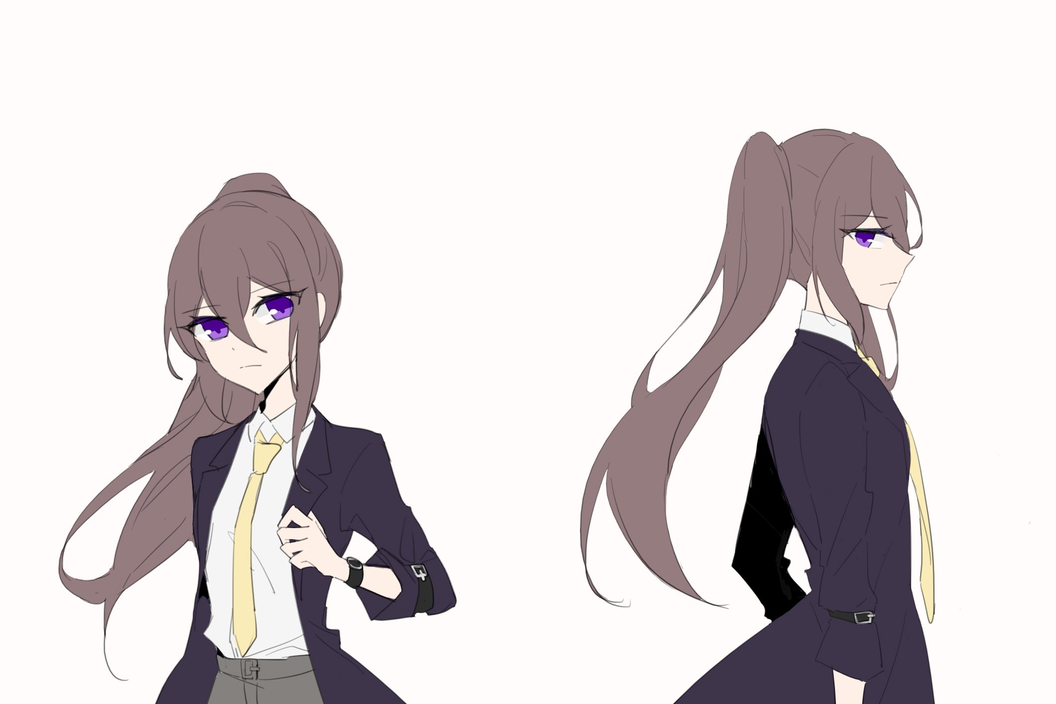 - 外貌设定:刘海中间长,左边鬓发长。紫色瞳,深亚麻色长发,大高马尾,奶白色领带,过膝黑袜,右耳黑耳钉。左手黑色手表。B cup。