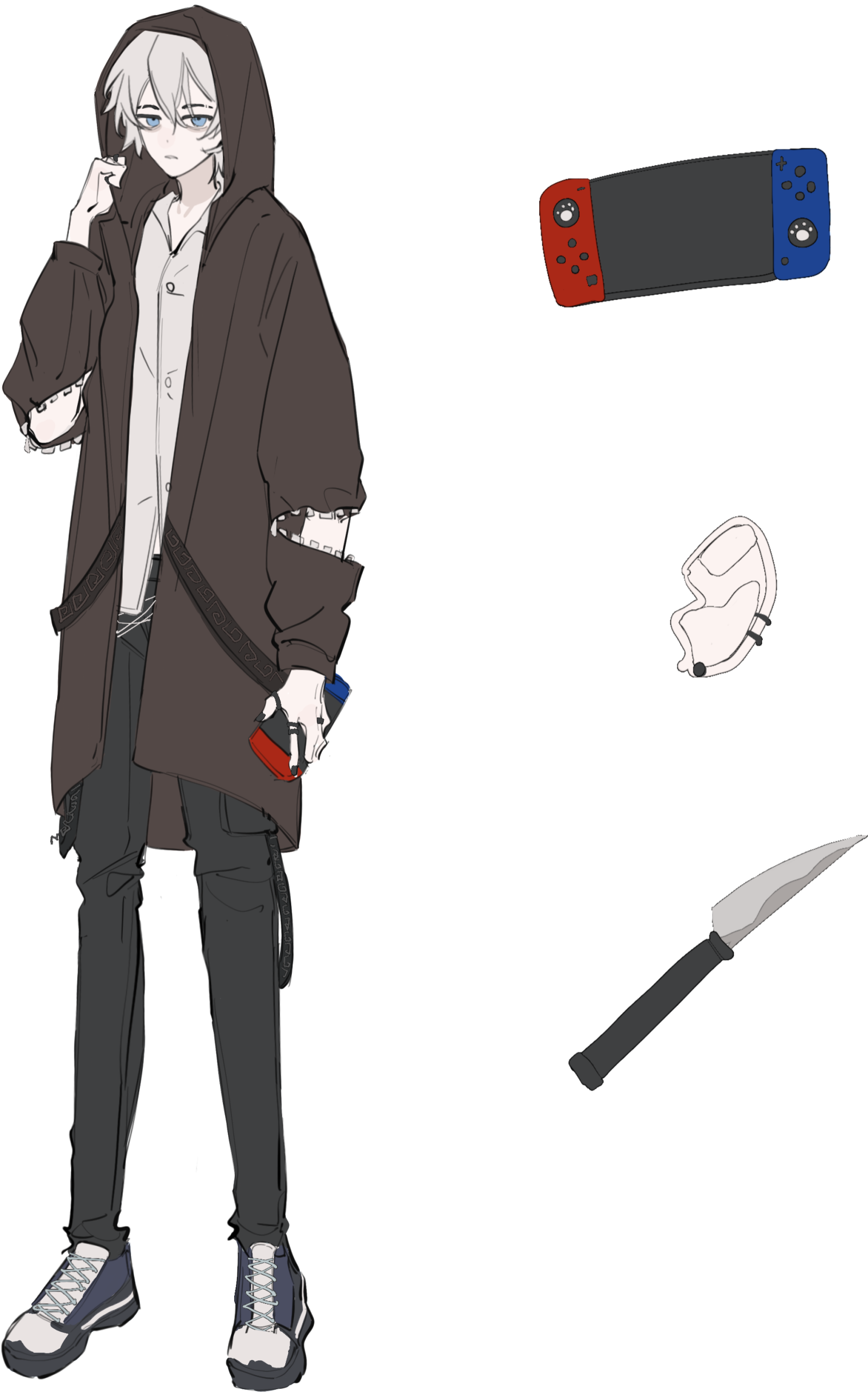 - 其他情报:表面是散漫暴力的不良少年头目,实则正义感极强,以 “以暴制暴” 守护弱者。厌恶循规蹈矩,有点中二病,会随身携带一些 “武器”。平时会带着兜帽,掩盖一些气场,因为喜欢打游戏所以会熬夜,有黑眼圈,所以看起来不太精神的样子,