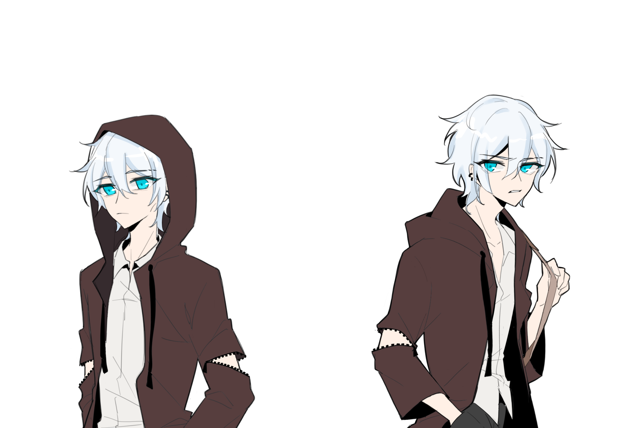 - 外貌设定:断眉,黑眼圈,冰蓝瞳,较长银白色发,耳饰。